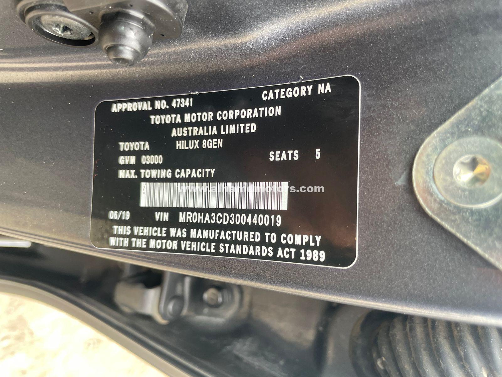 Toyota Hilux Pickup SR5 / 2019 Model / Fabric Seats / A/C / Airbag / Alloy Wheels / Mileage = 26,500 km / Manual Transmission / Power Steering / Power Window Central Locking / Power Mirror / Turbo / ABS / Navigation / 4WD / TV / CD Player / AM / FM Radio / Non-Smoker / Side Airbag / Spare Tire / Fog Lights / Push Start / Keyless Entry / Used Tires ,Australia Specs